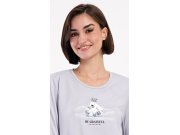 Ženska pamučna duga pidžama Polar bear. Ženska pidžama sastoji se od majice s dugim rukavima i dugih hlača. Majica je jednobojna, ukrašena slikom veselog polarnog medvjeda i natpisom Be grateful. Sličice medvjeda ponavljaju se i na hlačama, koje u struku imaju gumu i vezicu za stezanje, nemaju džepove. Korišteni pamučni materijal je mekan i ugodan na dodir.