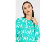 Ženska pamučna duga pidžama Santa. Ženska pidžama sastoji se od majice s dugim rukavima i dugih hlača. Majica je ukrašena natpisima HO ho i pahuljama, donji rub završava gumom. Crne hlače imaju print kape Djeda Božićnjaka i natpis Merry Christmas. Hlače su u struku na gumu i nemaju džepove, nogavice su dolje završene rubom s gumom. Korišteni pamučni materijal je podatak i ugodan na dodir.