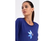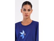 Ženska pamučna duga pidžama Sára. Ženska pidžama sastoji se od majice s dugim rukavima i dugih hlača. Majica je jednobojna, ukrašena slikom cvijeta i malim natpisom Good vibes. Cvjetni uzorak ponavlja se i na hlačama, koje u struku imaju gumu i vezicu za stezanje, nemaju džepove. Korišteni pamučni materijal je podatak i ugodan na dodir.