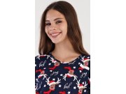 Ženska pamučna duga pidžama Sob. Ženska pidžama sastoji se od majice s dugim rukavima i dugih hlača. Majica je ukrašena natpisom, slikama sobova s božićnom kapom i natpisima JOY. Isti motiv se ponavlja i na hlačama. Hlače imaju elastičnu traku u struku, vezicu za stezanje i završene su rubovima. Korišteni materijal je podatak i nježan na dodir. Hlače i majica su izrađene od 100% pamuka.