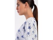 Ženska pamučna duga pidžama Stars. Ženska pidžama sastoji se od majice s dugim rukavima i dugih hlača. Majica je jednobojna, s printom zvjezdica. Ovaj motiv se ponavlja i na hlačama, koje u struku imaju gumu i vezicu za stezanje, nemaju džepove. Korišteni pamučni materijal je mekan i ugodan na dodir.