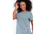 Ženska pamučna kapri pidžama Francesca. Ženska pidžama sastoji se od majice s kratkim rukavima i tročetvrt hlača. Majicu s okruglim izrezom krasi slika cvijeća. Ovaj motiv se ponavlja i na hlačama, koje u struku imaju gumu i vezicu za zatezanje, bez džepova su. Korišteni pamučni materijal je ugodan i mekan na dodir.