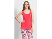Ženska kapri pidžama Jagoda. Pidžama se sastoji od majice bez rukava sa širokim naramenicama i elastičnih hlača tričetvrt dužine. Na majici se nalazi lijepa mala slika crvene jagode, ista slika se ponavlja i na elastičnim hlačama. Korišteni materijal je ugodan i podatak na dodir. Sastav hlača je 50% pamuk, 45% poliester i 5% elastan, a majica je 100% pamuk.
