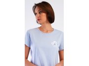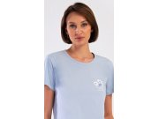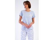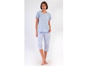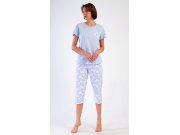 Ženska pamučna kapri pidžama Nature. Ženska pidžama sastoji se od majice s kratkim rukavima i tročetvrt hlača. Majica s okruglim izrezom ima na prsima sliku cvijeta. Ovaj motiv se ponavlja i na hlačama, koje u struku imaju gumu i vezicu za stezanje, bez džepova su. Korišteni pamučni materijal je ugodan i mekan na dodir.