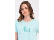 Ženska pamučna kapri pidžama Simona. Ženska pidžama sastoji se od majice s kratkim rukavima i tročetvrt hlača. Majica s okruglim izrezom ima na prsima sliku grančice i mali natpis. Motiv grančica ponavlja se i na hlačama, koje u struku imaju gumu i vezicu za stezanje, bez džepova su. Korišteni pamučni materijal je ugodan i mekan na dodir.