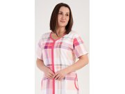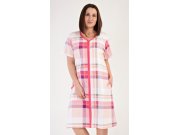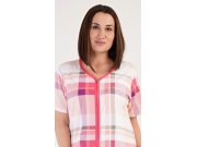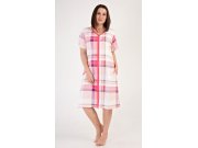 Ženska pamučna kućna haljina s kratkim rukavima Catherine. Ženska haljina ima kopčanje na patentni zatvarač i u potpunosti je ukrašena nježnim kariranim uzorkom. Na prednjem dijelu su našiveni džepovi ukrašeni paspulom. Pamučni materijal je podatak i ugodan na dodir.