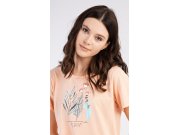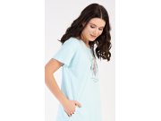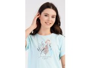 Ženska pamučna kućna haljina s kratkim rukavima Garden. Ženska haljina s okruglim izrezom ukrašena je cvjetnim printom i decentnim natpisom. Na bokovima ima ušivene džepove ukrašene paspulom. Korišteni pamučni materijal je ugodan i mekan na dodir. Haljina je pogodna za spavanje i svakodnevno nošenje.