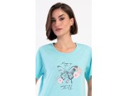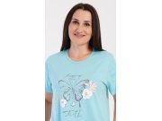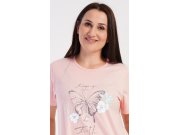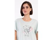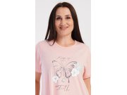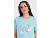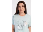Ženska pamučna kućna haljina s kratkim rukavima Leptir. Kućna haljina s okruglim izrezom i džepovima ima na prsima sliku leptira i natpis Keep up your faith. Korišteni pamučni materijal je ugodan i mekan na dodir. Haljina je udobna, možete je koristiti gotovo za sve slobodne aktivnosti. Prikladna je za spavanje i za svakodnevno nošenje.