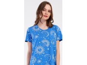 Ženska pamučna kućna haljina s kratkim rukavima Mjesec. Kućnu haljinu s okruglim izrezom i džepovima krase slike sunca i mjeseca. Korišteni pamučni materijal je ugodan i mekan na dodir. Haljina je udobna, možete je koristiti gotovo za sve slobodne aktivnosti. Prikladna je za spavanje i svakodnevno nošenje.
