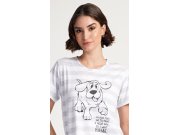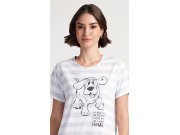 Ženska kućna haljina s kratkim rukavima Sarah. Prugasta kućna haljina s okruglim izrezom i džepovima ima na prsima sliku psa koji se veseli svom vlasniku. Korišteni materijal s udjelom pamuka 70% je ugodan i mekan na dodir.