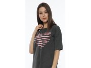Ženska kućna haljina s kratkim rukavima Srce. Udobna ženska haljina tipa dukserice ima u donjem dijelu vezicu za zatezanje. Na prednjem dijelu nalazi se slika srca s efektom koji podsjeća na proreze. Haljina je zahvaljujući svom kroju udobna i sigurno ćete je koristiti gotovo za sve slobodne aktivnosti. Korišteni materijal je ugodan i podatak na dodir.