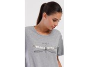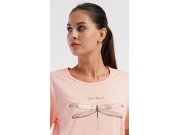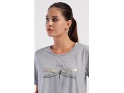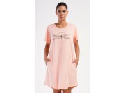 Ženska pamučna kućna haljina s kratkim rukavima Vilibeg. Jednobojna kućna haljina s okruglim izrezom i džepovima ukrašena je slikom vilibega i natpisom Beautiful. Korišteni pamučni materijal je ugodan i mekan na dodir. Haljina je udobna, možete je koristiti gotovo za sve slobodne aktivnosti. Prikladna je za spavanje i svakodnevno nošenje.