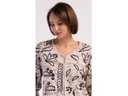 Ženska pamučna kućna haljina s tročetvrt rukavima Elena. Udobna haljina na kopčanje, ugodne duljine ispod koljena, pogodna za gotovo sve slobodne aktivnosti. Ima praktične džepove i kopčanje na patentni zatvarač. Haljina je ukrašena listovima i cvjetovima. Korišteni pamučni materijal je ugodan i mekan na dodir.