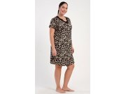 Ženska noćna košulja s kratkim rukavima Audrey. Noćna košulja ugodne dužine do koljena ima rebraste detalje na rukavima i donjem rubu, a izrez je ukrašen čipkom. Tkanina košulje je otisnuta leopard uzorkom. Korišteni viskozni materijal s dodatkom likre je ugodan i mekan na dodir.