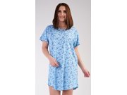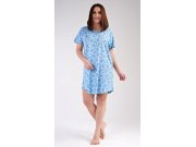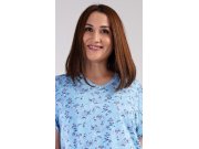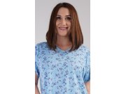 Ženska pamučna noćna košulja s kratkim rukavima Bára. Ženska noćna košulja ugodne duljine iznad koljena ima mali V-izrez i obrub oko izreza. Na svijetloplavoj podlozi otisnuti su nježni cvjetovi i listovi. Korišteni materijal sa 100% udjelom pamuka je ugodan i mekan na dodir.