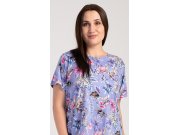 Ženska pamučna noćna košulja s kratkim rukavima Betty. Ženska noćna košulja s okruglim izrezom ima ugodnu dužinu iznad koljena. Košulja s kratkim rukavima je ukrašena egzotičnim cvjetovima. Korišteni pamučni materijal je ugodan i mekan na dodir.