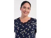 Ženska noćna košulja s kratkim rukavima Butterflies. Noćna košulja ugodne dužine do koljena ima rebraste detalje na rukavima i donjem rubu, a izrez je ukrašen čipkom. Tkanina košulje je oslikana sitnim leptirićima. Korišteni viskozni materijal s dodatkom likre je ugodan i podatak na dodir.