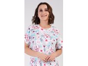 Ženska pamučna noćna košulja s kratkim rukavima Elen. Ženska noćna košulja ugodne duljine iznad koljena ima okrugli izrez. Na tkanini košulje otisnuti su cvjetni motivi. Korišteni pamučni materijal je nježan i mekan na dodir.