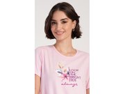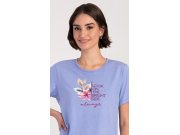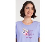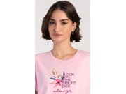 Ženska pamučna noćna košulja s kratkim rukavima Elizabeth. Noćna košulja s okruglim izrezom i ugodnom dužinom iznad koljena ima na prsima sliku egzotičnog cvijeća i natpis Look on the bright side always. Korišteni materijal sa 100% udjelom pamuka je ugodan i mekan na dodir.