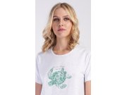 Ženska noćna košulja s kratkim rukavima Kornjača. Noćna košulja s okruglim izrezom i ugodnom dužinom iznad koljena ima na prsima sliku kornjače i mali natpis. Korišteni materijal s udjelom pamuka 70% je ugodan i podatak na dodir.