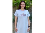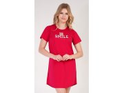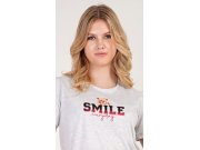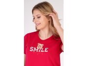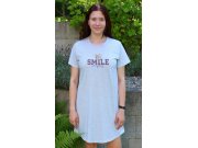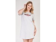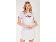 Ženska noćna košulja s kratkim rukavima Medo Smile. Noćna košulja s okruglim izrezom ima na prsima sliku plišanog medvjedića i natpis SMILE everyday. Korišteni materijal je ugodan i mekan na dodir. Sadržaj pamuka kod jagoda boje je 100%, a kod svijetlo sive 70%.