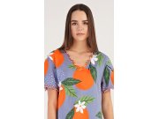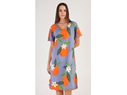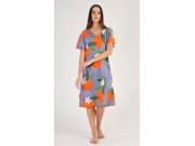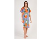 Ženska pamučna noćna košulja s kratkim rukavima Naranče. Noćna košulja ugodne duljine ispod koljena ima ukrasne nabore oko izreza, rukava i donjeg ruba, koji je dodatno ukrašen prorezom. Na tkanini košulje otisnute su naranče i listovi. Korišteni pamučni materijal je ugodan i mekan na dodir.
