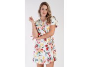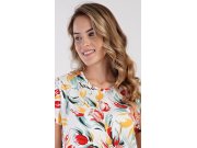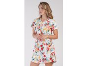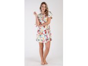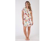 Ženska pamučna noćna košulja s kratkim rukavima Sofie. Ženska noćna košulja s okruglim izrezom ima ugodnu dužinu iznad koljena. Na bijeloj podlozi otisnuti su veći cvjetovi i listovi. Korišteni pamučni materijal je ugodan i mekan na dodir.