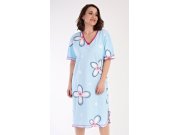 Ženska pamučna noćna košulja s kratkim rukavima Veronika. Noćna košulja ugodne duljine ispod koljena ima ukrasne nabore oko izreza, rukava i donjeg ruba, koji je dodatno ukrašen prorezom. Na tkanini košulje otisnuti su veliki cvjetovi. Korišteni pamučni materijal je ugodan i mekan na dodir.