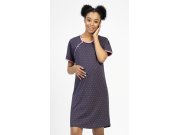 Ženska pamučna noćna košulja za trudnice Martina. Ženska noćna košulja za trudnice krojena je tako da odgovara razdoblju trudnoće, za boravak u rodilištu i za dojenje. Za dojenje služe otvori sa stranicae košulje koji se zatvaraju na gumbe. Tkanina noćne košulje je ukrašena sitnim točkicama i obrubom na izrezu i rukavima u boji točkica. Korišteni materijal sadrži 100% pamuk, ugodan je i mekan na dodir.