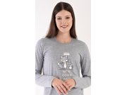 Ženska pidžama duga Forest party. Ženska pidžama sastoji se od majice s dugim rukavima i dugih hlača. Majica je jednobojna, ukrašena slikom životinja u šumi i natpisom TODAY WILL BE A GOOD DAY. Hlače su svijetlosive, također s printom životinja. Hlače imaju elastičnu traku u struku i vezicu za stezanje. Korišteni materijal je podatak i ugodan na dodir.