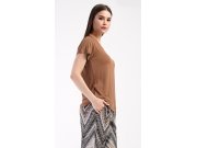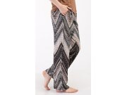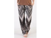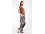 Ženska pidžama s kratkim rukavima Julie. Ženska pidžama se sastoji od majice s kratkim rukavima i dugih hlača. Majica je jednobojna, bez tiska, ima okrugli izrez. Hlače s otisnutim geometrijskim uzorkom imaju u struku gumu i vezicu za stezanje, nemaju džepove. Korišteni viskozni materijal je podatak i ugodan na dodir.