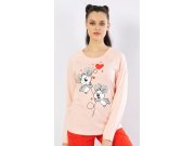 Ženska pidžama duga Koale. Ženska pidžama sastoji se od majice s dugim rukavima i dugih hlača. Na svijetloj majici nalazi se velika slika dviju slatkih koala koje lete na balonu u obliku srca. Koale okružuju mala srca i zvjezdice. Duge hlače su ukrašene sjajnim srcima i zvjezdicama. Korišteni materijal je nježan i mekan na dodir. Pidžama je pogodna i za svakodnevno nošenje.
