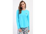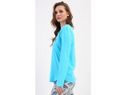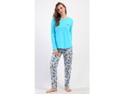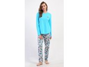 Ženska pamučna duga pidžama Listovi. Ženska pidžama se sastoji od majice s dugim rukavima i dugih hlača. Majica je jednobojna, ukrašena malom slikom lista na prsima. Motiv listova se ponavlja i na hlačama, koje u struku imaju gumu i vezicu za stezanje, nemaju džepove. Korišteni pamučni materijal je mekan i ugodan na dodir.