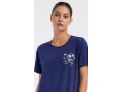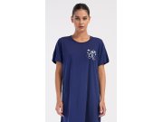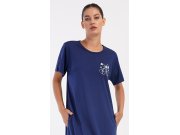 Ženska pamučna kućna haljina s kratkim rukavima Janette. Kućna jednobojna haljina s okruglim izrezom i džepovima ukrašena je na prsima slikom s cvjetnim motivom. Korišteni pamučni materijal je ugodan i mekan na dodir. Haljina je udobna, pogodna za spavanje i svakodnevno nošenje.