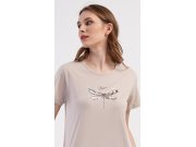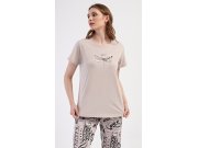 Ženska pamučna kapri pidžama Elena. Ženska pidžama se sastoji od majice s kratkim rukavima i tročetvrtnih hlača. Majicu s okruglim izrezom na prsima krasi slika vilinog konjica. Hlače s printom lišća i cvijeća imaju u struku gumu i vezicu za stezanje, bez džepova su. Korišteni pamučni materijal je ugodan i mekan na dodir.