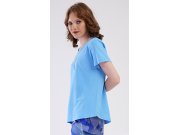 Ženska pamučna kapri pidžama Eliza. Ženska pidžama se sastoji od majice s kratkim rukavima i tročetvrt hlača. Majica s okruglim izrezom ima na prsima sliku s geometrijskim uzorkom. Ovaj motiv se ponavlja i na hlačama, koje u struku imaju gumu i vezicu za stezanje, bez džepova su. Korišteni pamučni materijal je ugodan i mekan na dodir.