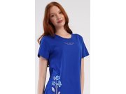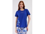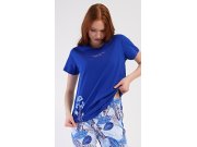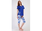 Ženska pamučna kapri pidžama Julie. Ženska pidžama sastoji se od majice s kratkim rukavima i tročetvrt hlača. Majicu s okruglim izrezom na donjem dijelu krasi slika cvijeća. Hlače s printom lišća imaju u struku gumu i vezicu za stezanje, bez džepova su. Korišteni pamučni materijal je ugodan i mekan na dodir.
