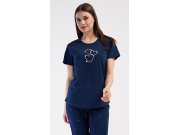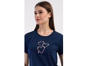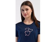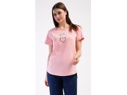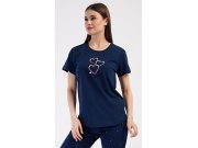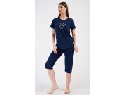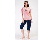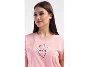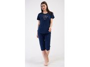 Ženska pamučna kapri pidžama Srce. Ženska pidžama sastoji se od majice s kratkim rukavima i tročetvrt hlača. Majicu s okruglim izrezom na prsima krasi slika srca. Hlače s malim točkicama u struku imaju gumu i vezicu za stezanje, bez džepova su. Korišteni pamučni materijal je ugodan i mekan na dodir.