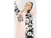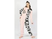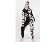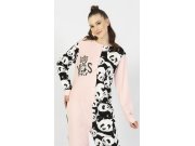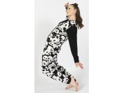 Ženski pamučni kombinezon Good vibes. Kombinezon se zakopčava cijelom dužinom - s jedne stranicae ukrašen je slikom pande i natpisom Good vibes only, a s druge stranicae ima cjeloplošni uzorak s pandama. Duge nogavice završavaju elastičnim rubovima. Pamučni materijal je podatak i ugodan na dodir.