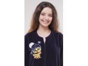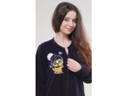 Ženski polarni kombinezon Tigrica. Ženski kombinezon ima okrugli izrez i kopčanje na patentni zatvarač. Rukavi i nogavice završavaju praktičnim rubovima. Suptilan kombinezon krasi aplikacija s motivom malog tigra koji nosi kapu s velikom coflekom. Na tamno plavoj podlozi je izvezen natpis. Korišteni materijal je topao i mekan na dodir, posebno će vam odgovarati u hladnim zimskim danima.