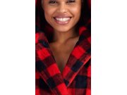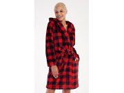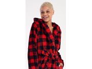 Ženski kratki soft ogrtač s kapuljačom Kostka. Ogrtač ima kapuljaču, praktične džepove i pojas za vezanje. Ukrašen je uzorkom kocke u crno-crvenoj boji. Korišteni soft materijal je nježan i mekan na dodir. Ogrtač će vas ugrijati na putu iz kupaonice ili tijekom opuštanja na kauču, bit će vaš dragi pratitelj u hladnim danima.
