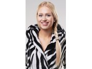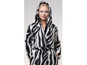 Ženski kratki soft ogrtač s kapuljačom Zebra. Ogrtač ima kapuljaču, džepove i pojas za vezanje. Ukrašen je zebrinim uzorkom u crno-bijeloj boji. Korišteni soft materijal je nježan i mekan na dodir. Ogrtač će vas ugrijati na putu iz kupaonice ili tijekom opuštanja na kauču, bit će vaš dragi pratitelj u hladnim danima.