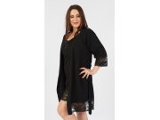 Ženski ogrtač s noćnom košuljom na naramenice Laura. Komplet se sastoji od noćne košulje na naramenice i ogrtača s pojasom za vezanje i rukavima tri četvrtine. Izrez, rukavi i donji rubovi ukrašeni su širokom čipkom. Korišteni pamučni materijal je ugodan i mekan na dodir.