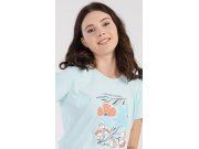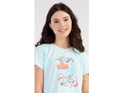 Ženski pamučni pidžama šorc Melissa. Ženski pidžama set sastoji se od majice s kratkim rukavima i kratkih hlača. Na jednobojnoj majici nalazi se slika sastavljena od cvjetova, listova i grančica. Isti motiv se ponavlja i na šorcu. Šorc ima u struku gumu i vezicu za stezanje, bez džepova. Korišteni pamučni materijal je ugodan i mekan na dodir.