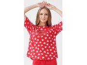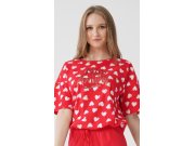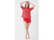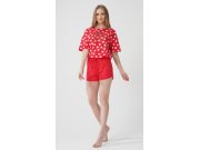 Ženski pamučni pidžama šorc Mon amour. Ženski pidžama šorc sastoji se od majice s kratkim rukavima i kratkih šorceva. Crvena majica je ukrašena bijelim srcima, a krasi je natpis MON AMOUR. Upadljivu majicu prikladno nadopunjuju jednobojni crveni šorcevi s gumom i vezicom za stezanje u struku. Korišteni pamučni materijal je ugodan i mekan na dodir.