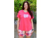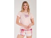 Ženski pamučni pidžama šorc Super girl. Ženska pidžama se sastoji od majice s kratkim rukavima i kratkih hlača. Na majici je natpis SUPER GIRL i srce. Karirani šorc ima u struku gumu i vezicu za stezanje. Korišteni pamučni materijal je ugodan i mekan na dodir.