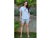 Ženska pidžama sa šorcem Zebra. Ženska pidžama se sastoji od majice s kratkim rukavima i šorca. Na jednobojnoj majici nalazi se slika vesele zebre i natpis Enjoy every day. Print malih zebra ponavlja se i na šorcu, koji ima elastičnu traku i vezicu u struku, bez džepova. Korišteni materijal je ugodan i mekan na dodir. Šorc je od 100% pamuka, majica u losos boji 100%, a u sivoj 70% pamuka.